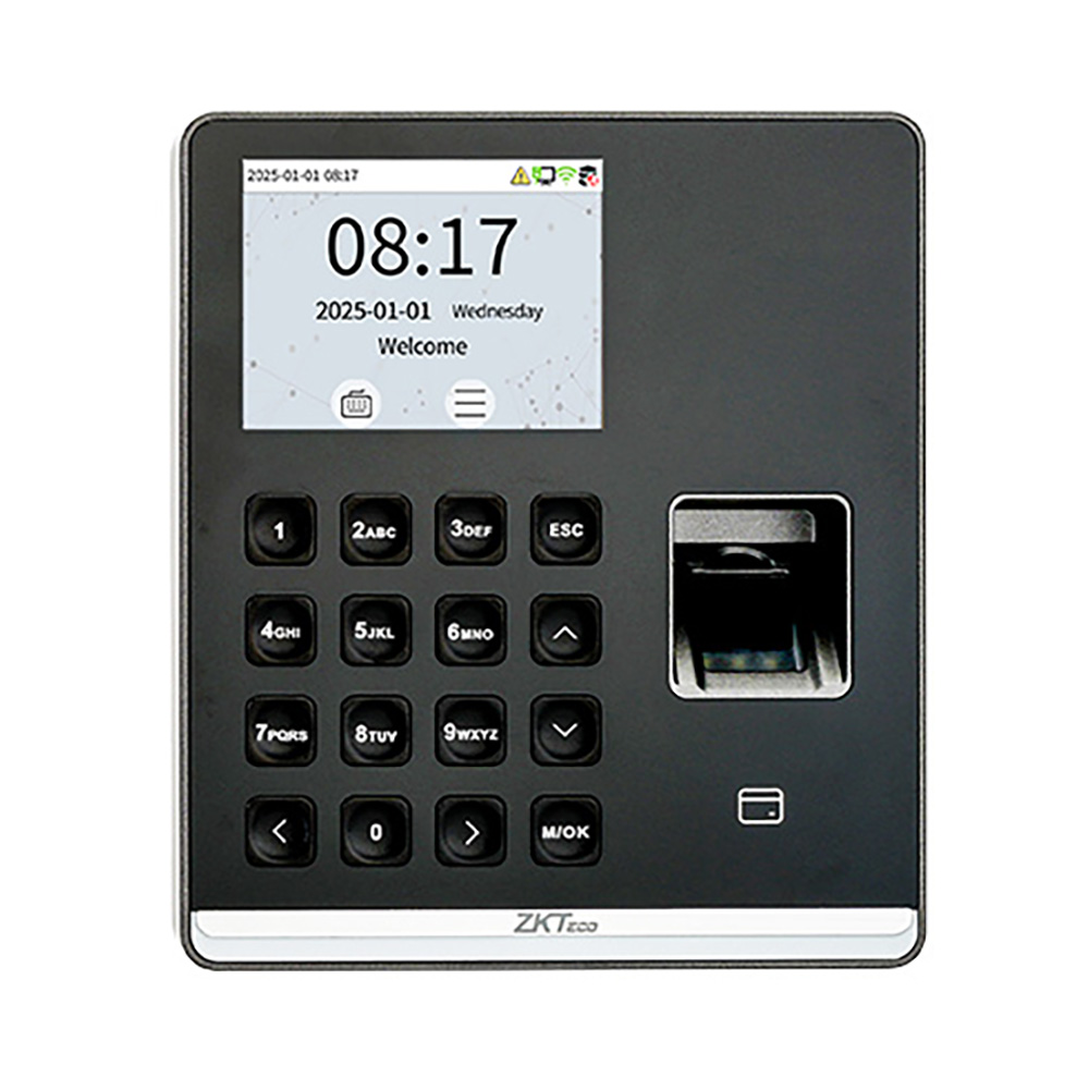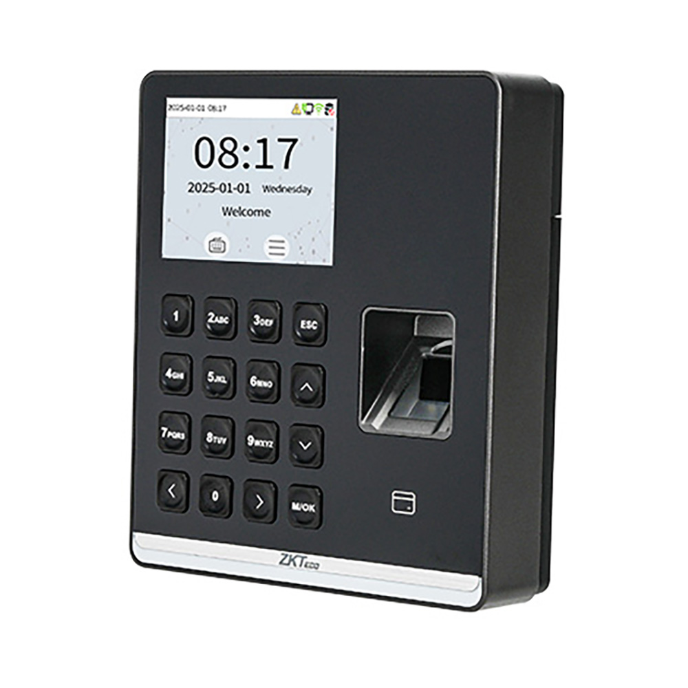 Биометрический терминал: идентификация: отпечаток пальца, RFID-карта, пароль; память: 500 отпечатков, 500 карт; журнал событий: 100000 записей; дисплей: 2.8" TFT LCD (320×240); форматы карт: EM-Marine (опция Mifare).